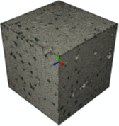 Les phénomènes d’endommagement (par fissuration) sont analysés à l’échelle microscopique via une approche numérique 3D couplée à une caractérisation expérimentale fine des microstructures hétérogènes obtenues par le procédé de fabrication additive SLS, Figures 2(a) et 2(b). A partir d’images de micro-tomographie aux RX 3D, les fissures tridimensionnels complexes et multiples (réseaux de fissures) sont identifiées, Figure 2(c). L’hétérogénéité de distribution des pores induite par le procédé est ensuite quantifiée. Lors de l’application d’un chargement mécanique en traction ou compression sur les échantillons obtenus par FA, la microstructure se déforme de manière hétérogène montrant ainsi une anisotropie de comportement tant élastique que plastique. Dans le cadre du Projet ANR MMELED (2017-2021) en partenariat avec les laboratoires MSME (Julien Yvonnet) et Navier (Michel Bornert), un modèle de fissuration 3D a été développé pour les matériaux fragiles et élastoplastiques, Avec la prise en compte de l’endommagement aux niveaux des interfaces matrice-inclusion, le modèle simule le réseau de fissures qui s’opère dans le VER à partir des maillages de la microstructure réelle obtenue par le procédé FA SLS, voir l’exemple du VER construit à partir d’un échantillon en polymère PA12 chargé en fibres de verre sur les Figures 2(a) et 2(c).