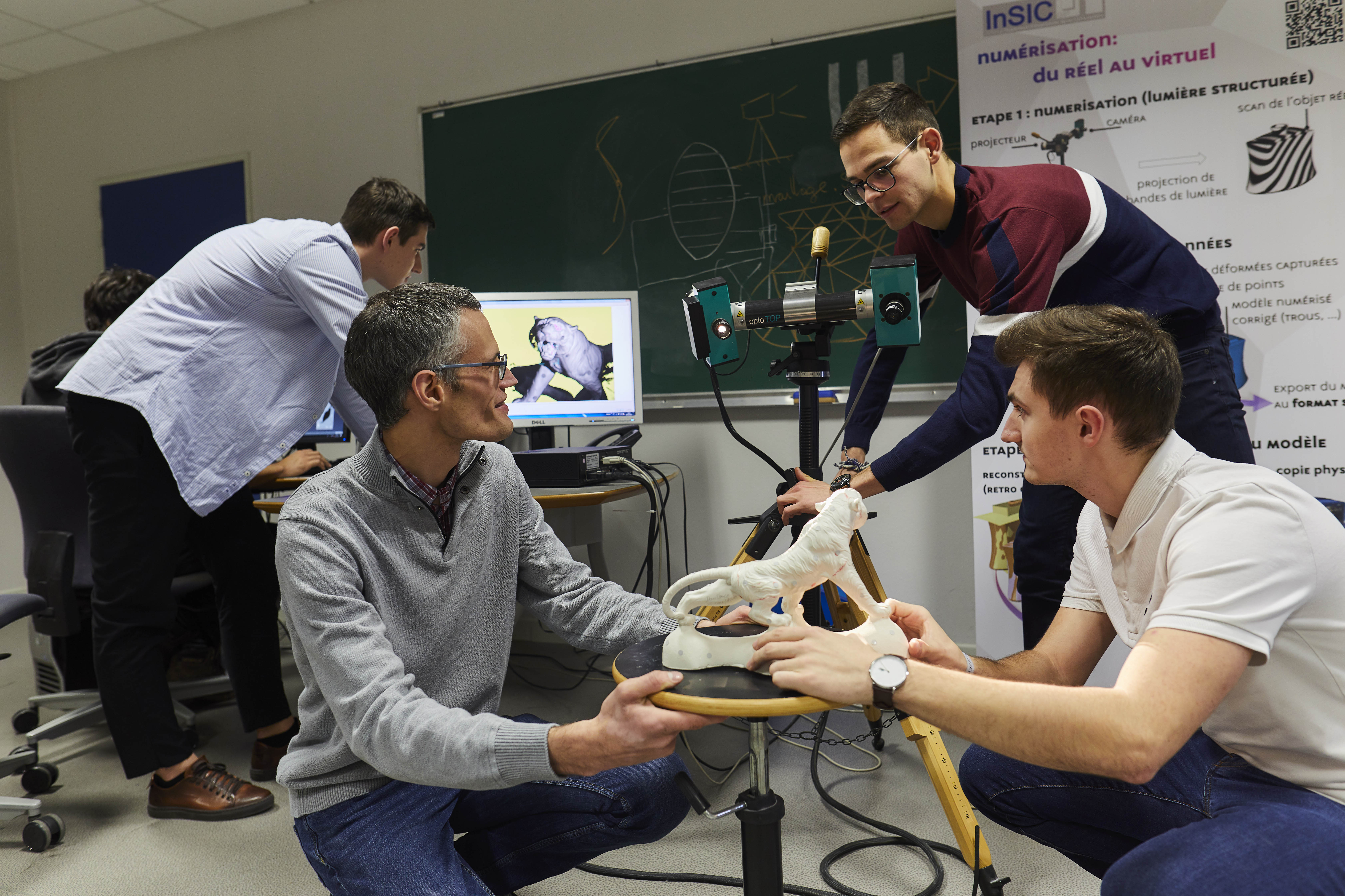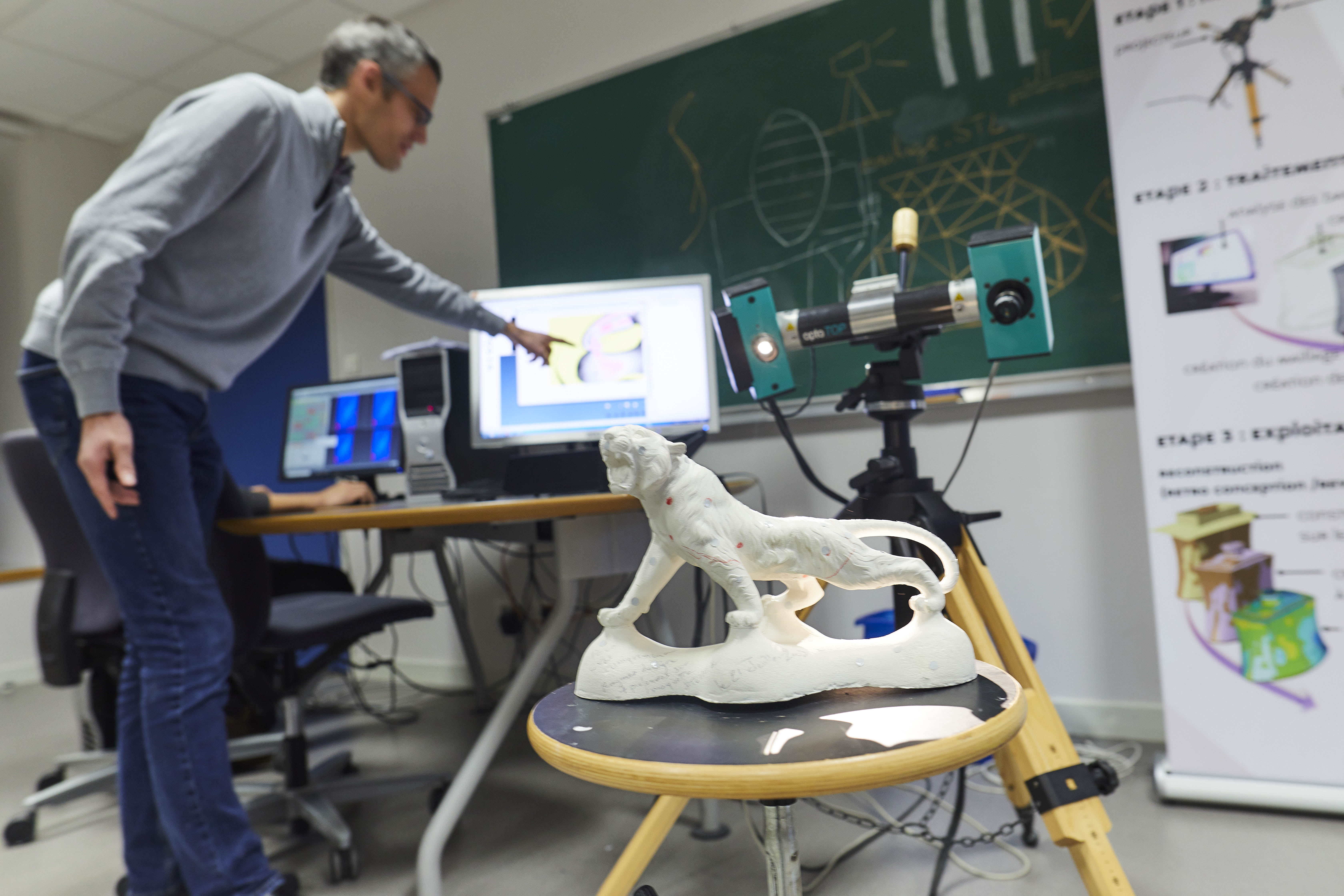 Plateforme NeRV "Numérisation" • Système de numérisation par lumière structurée OptoTOP-HE (précision de 4/100 de mm et 5/1000 de mm) avec logiciel d’acquisition OptoCAT • Plateforme CAO CATIA V5, 3D Expérience • Logiciels de traitement de nuages de points et reconstruction de surface, et de contrôle GEOMAGIC-Studio et GEOMAGIC-Qualify • Bras de mesure HEXAGON • EinScan